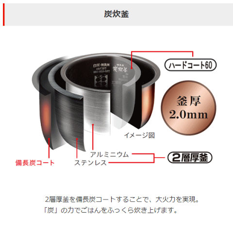 ・2層厚釜を備長炭コートすることで 大火力を実現。